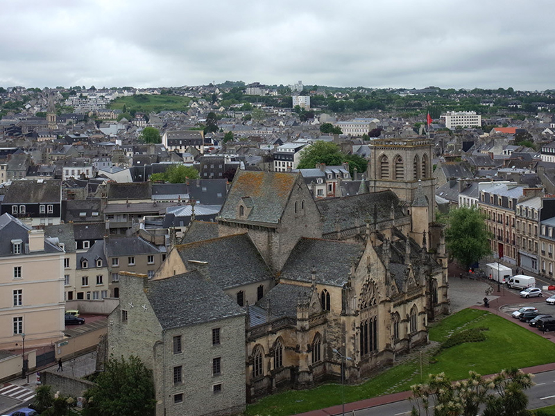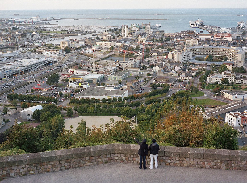 Город расположен на полуострове Котантен, на берегу Ла-Манша, и это не романтически сонная гавань с белоснежными яхтами, а серьёзнейший грузовой, пассажирский, торговый и военный порт (второй в стране по размерам). Он весь утыкан укреплёнными фортами, складами, заводскими зданиями, прочерчен дамбами и длиннущим волноломом.